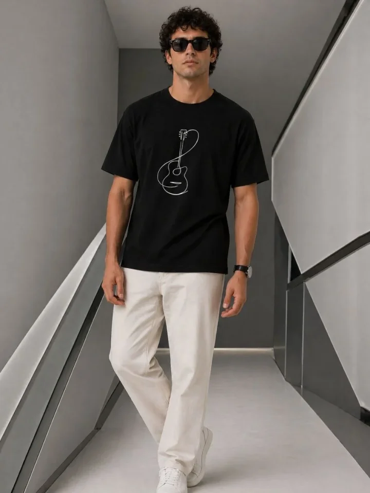 Erkek Minimal Gitar Baskılı Tişört T-Shirt Yazlık Kısa Kol Bisiklet Yaka T-Shirt – Siyah