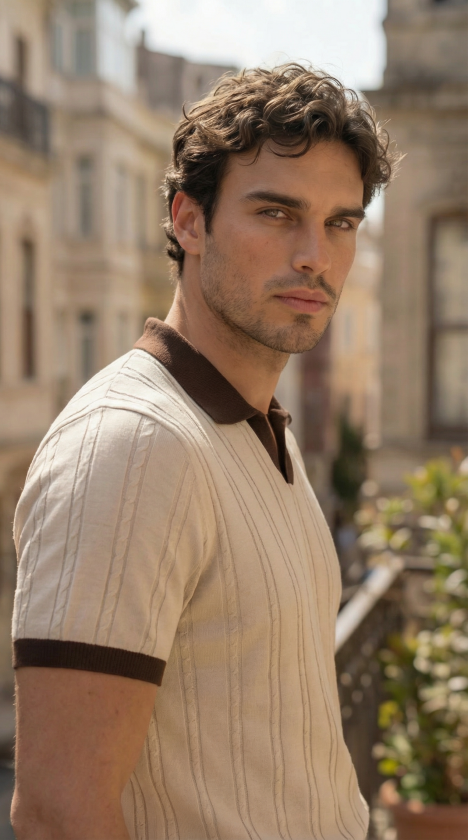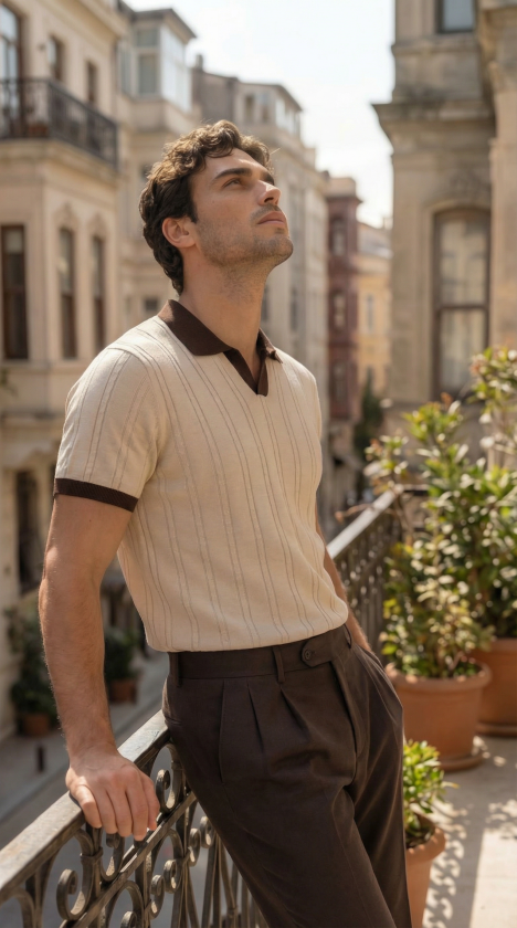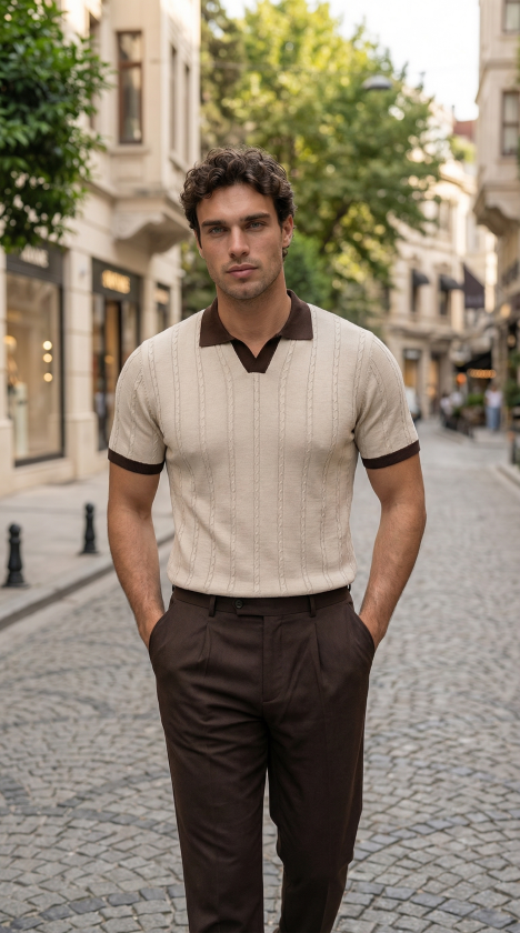 Erkek Örgü Desen Yakalı Kısa Kollu Triko Tişört – %100 Pamuk Akrilik