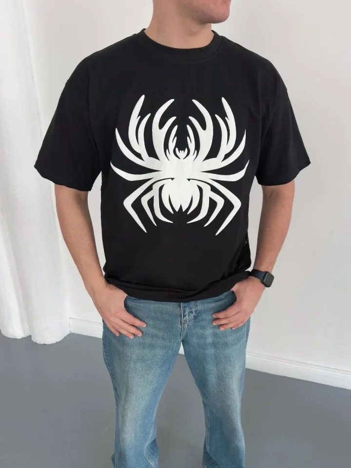 Erkek Örümcek Baskılı Tişört Kısa Kollu Bisiklet Yaka T-Shirt – Siyah