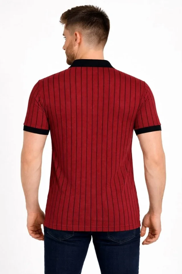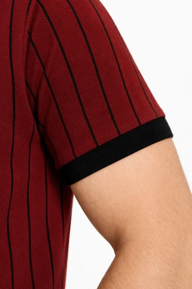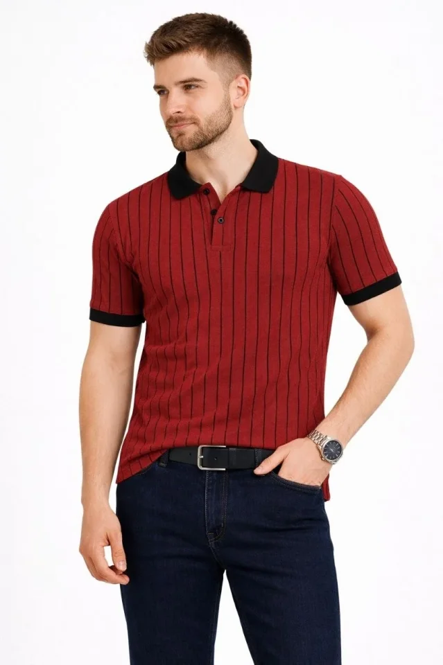 Erkek Polo Yaka Çizgili Tişört Kısa Kol Düğmeli Yazlık T-Shirt – Bordo
