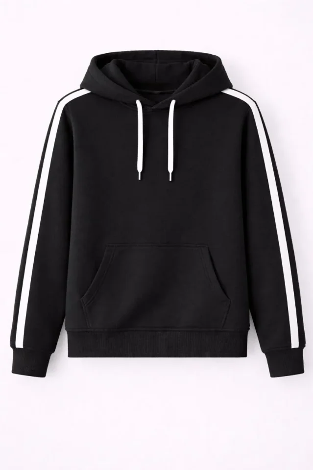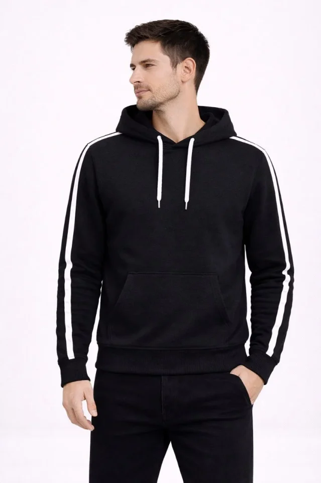 Erkek Şeritli Kapüşonlu Sweatshirt Oversize 3 Iplik Pamuklu – Siyah
