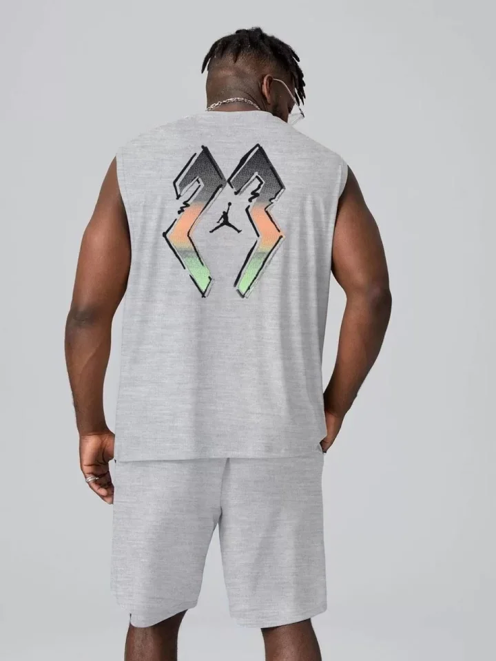 Erkek Sırt Baskılı Sıfır Kol İkili Şort Takım – Gri