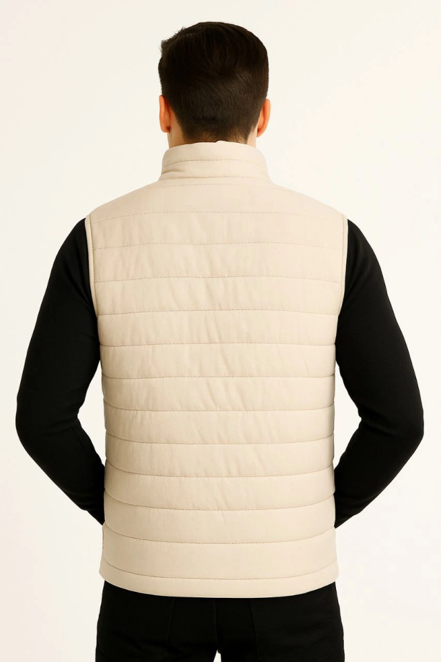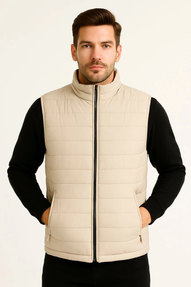 Erkek Günlük Şıklık Şişme Fermuarlı Su Itici Kapitone Astarlı Kumaş Cepli Hafif Kışlık Spor Rahat Kalıp -Bej Yelek