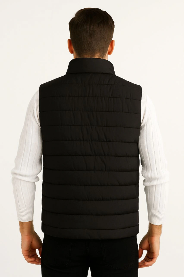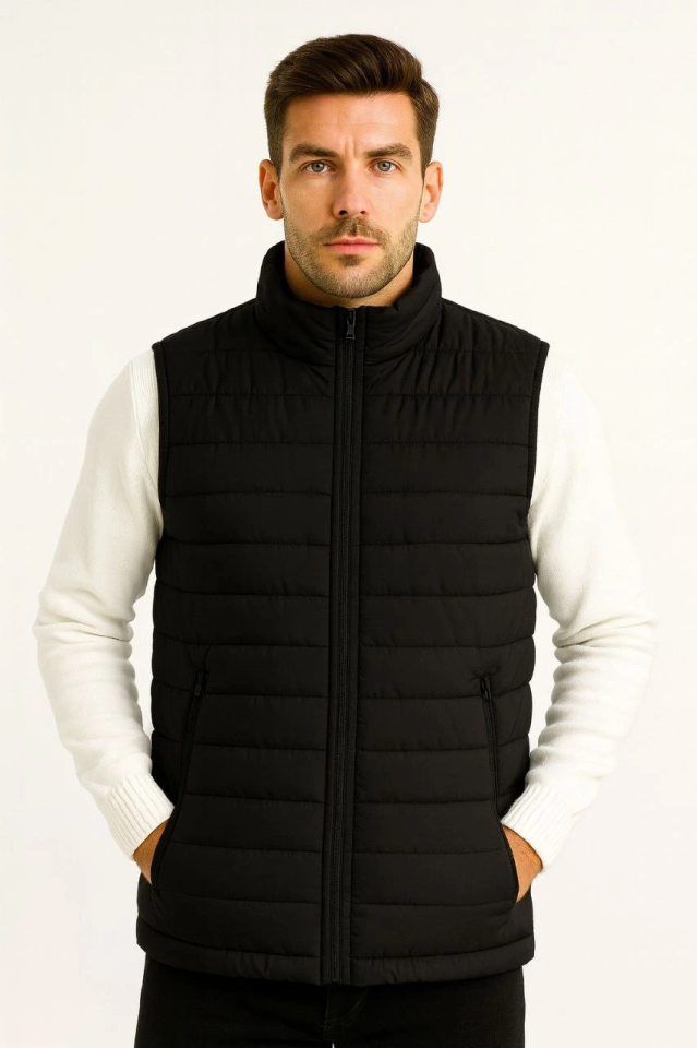 Erkek Şişme Fermuarlı Yelek Su Itici Kapitone Astarlı Kumaş Cepli Hafif Kışlık Spor Rahat Kalıp – Siyah