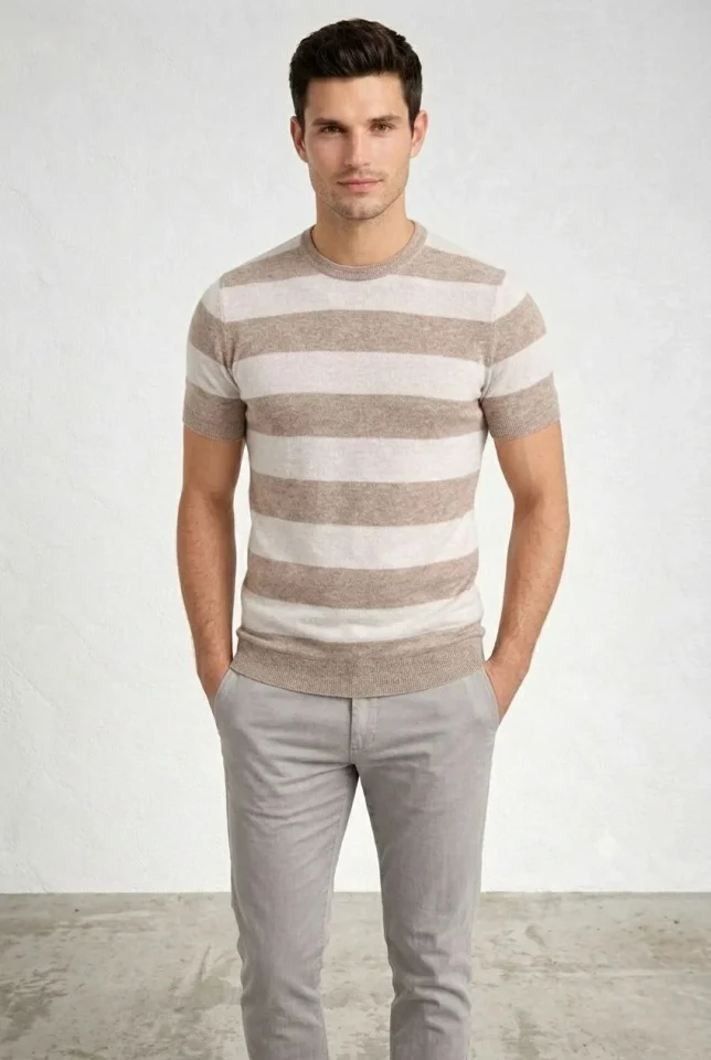 Erkek Günlük Stil Bej Çizgili Triko Dokuma Bisiklet Yaka Tişört
