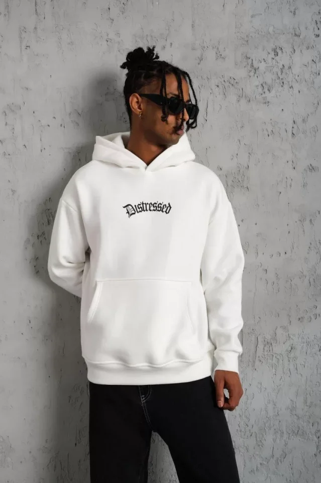 Üç İplik Şardonlu Erkek Sıcak Tutan Beyaz Grafik Baskılı Kapüşonlu Sweatshirt