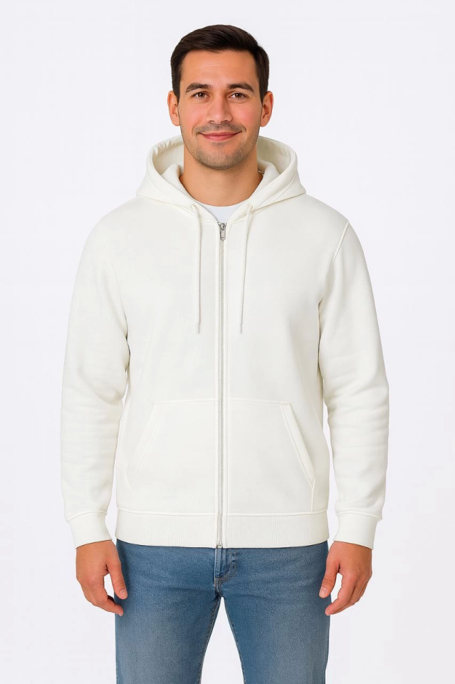 Erkek Üç İplik Kapüşonlu Tam Fermuarlı Kanguru Çepli SweatShirt Hoodie – Beyaz