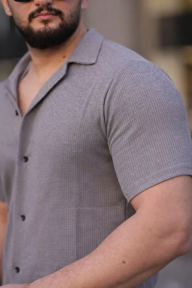 Lacivert Gömlek Waffle Erkek Günlük Şıklık Gri Dokuma Açık Yakalı Düğmeli Regular Kalıp 2’li Seti