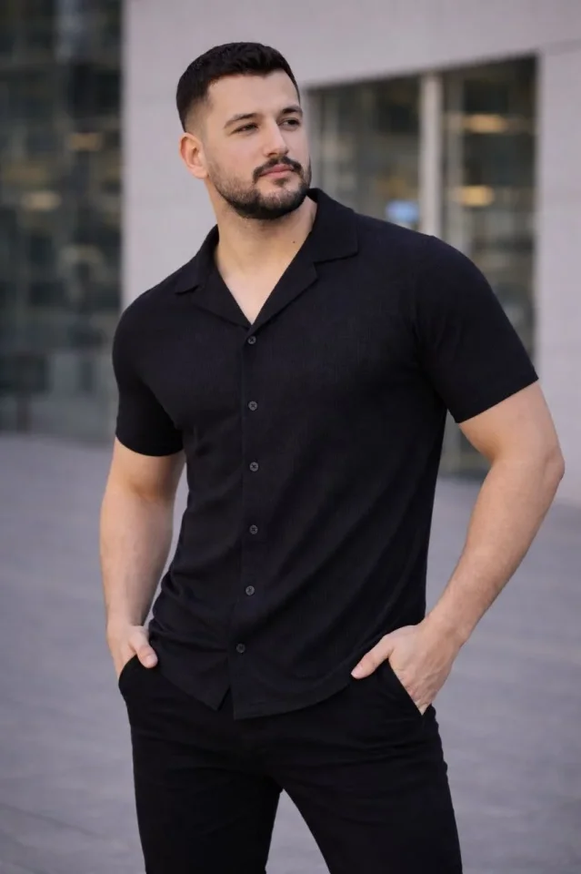 Waffle Kumaş Erkek Günlük Şıklık Siyah Kısa Kollu Düğmeli Açık Yaka Regular Fit Gömlek