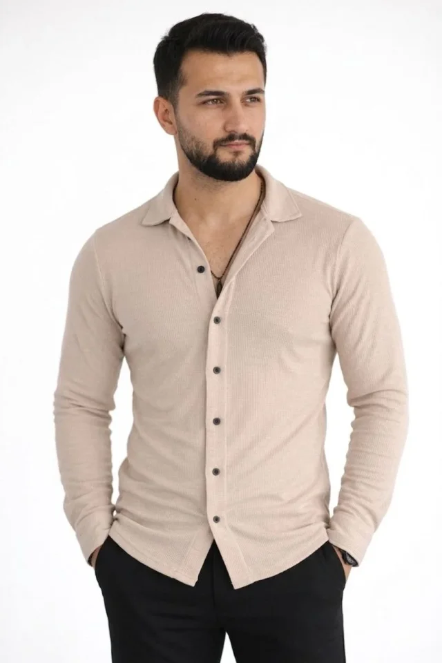 Waffle Kumaş Erkek Günlük Şıklık Bej Uzun Kollu Düğmeli Açık Yaka Regular Fit Gömlek