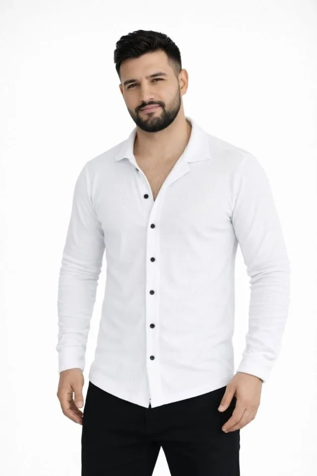 Erkek Waffle Kumaş Uzun Kollu Düğmeli Açık Yaka Regular Fit Gömlek – Beyaz