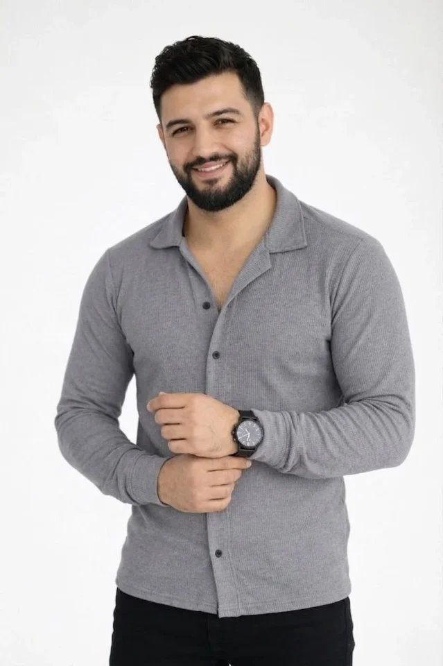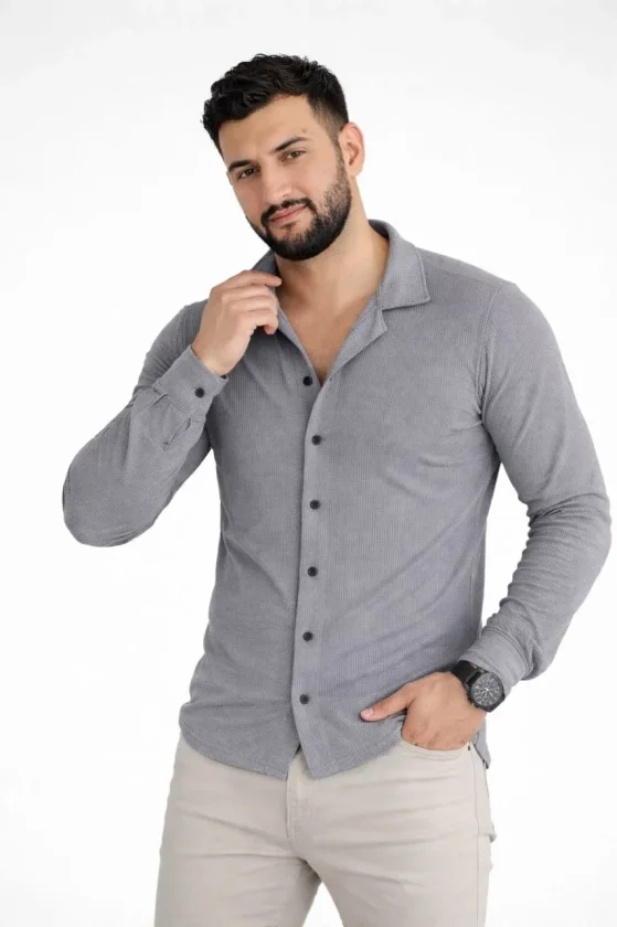 Waffle Kumaş Erkek Günlük Şıklık Füme Uzun Kollu Düğmeli Açık Yaka Regular Fit Gömlek