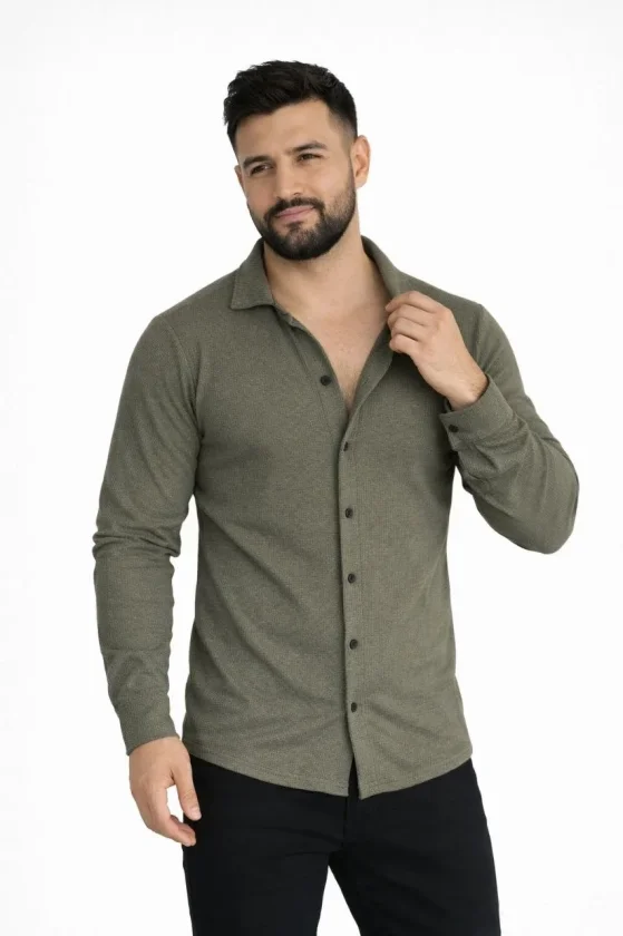 Waffle Kumaş Erkek Günlük Şıklık Haki Uzun Kollu Düğmeli Açık Yaka Regular Fit Gömlek