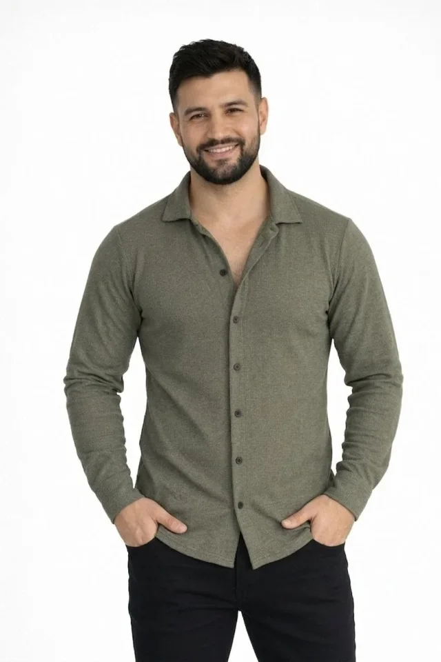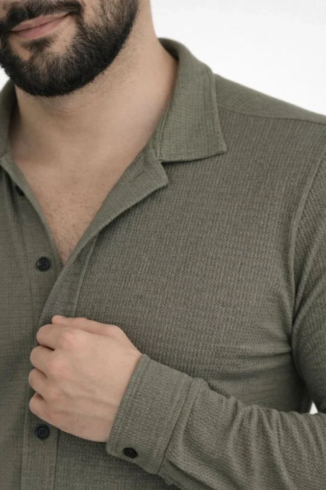 Erkek Waffle Kumaş Uzun Kollu Düğmeli Açık Yaka Regular Fit Gömlek – Haki