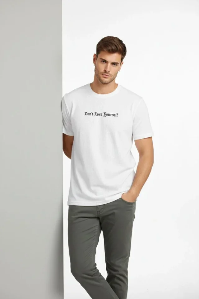 Erkek Wafıl Kumaş Tişört Regular Kalıp Bisiklet Yaka Baskılı Günlük Basic T-Shirt – Beyaz