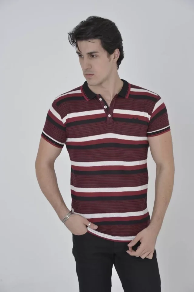 Erkek Yakalı Slim Fit Dokuma Çizgili T-Shirt – Bordo