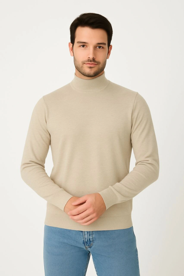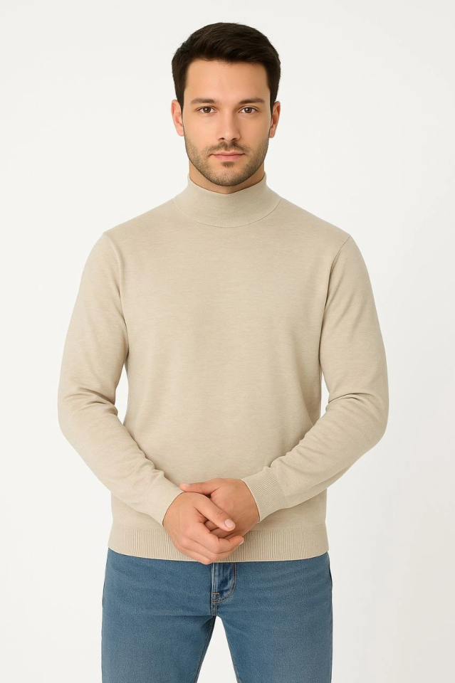 Erkek Yarım Boğaz Triko Kazak Yumuşak Dokulu Pamuklu Ince Dokuma, Uzun Kollu Rahat Regular Kalıp – Bej