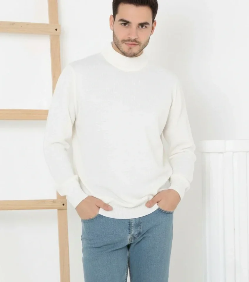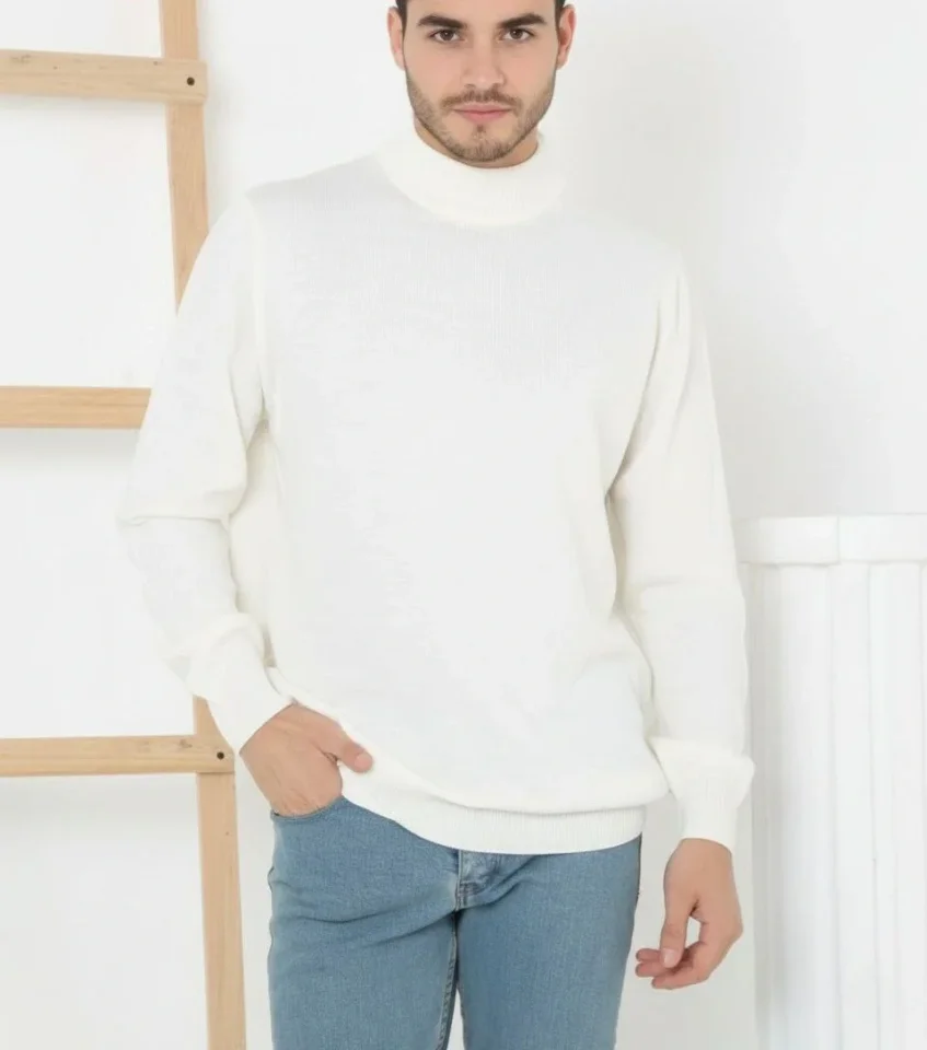 İnce Dokuma Erkek Sıcak Tutan Beyaz Yumuşak Pamuklu Yarım Boğazlı Kazak