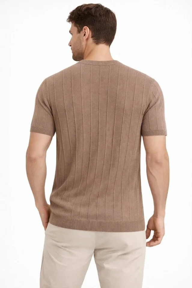 Erkek Yazlık Fitilli Triko Tişört Kısa Kol Bisiklet Yaka T-Shirt – Kahverengi
