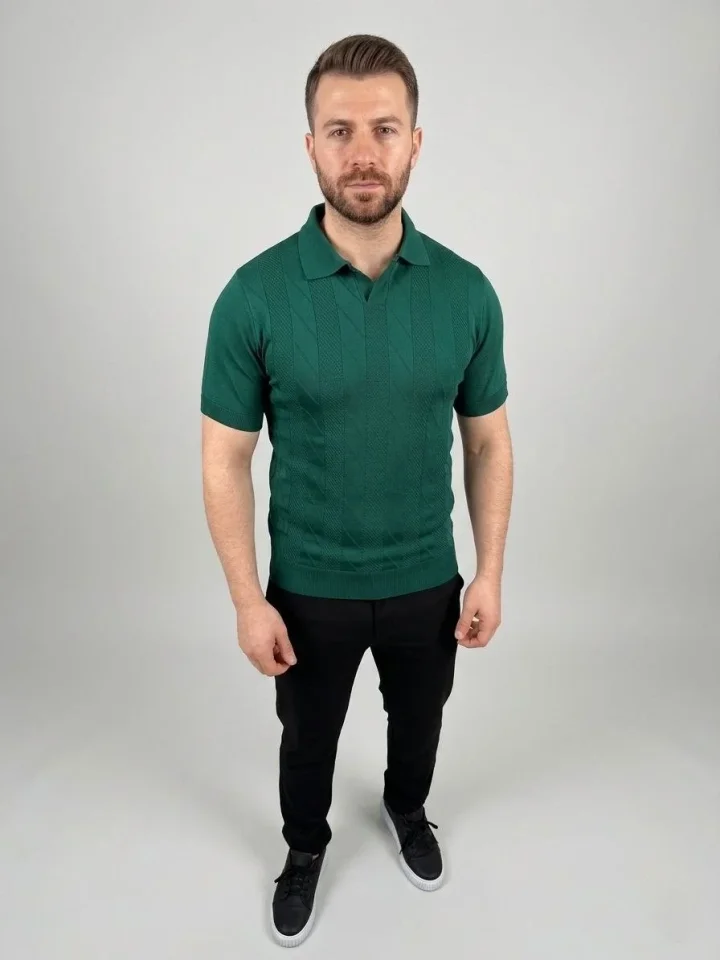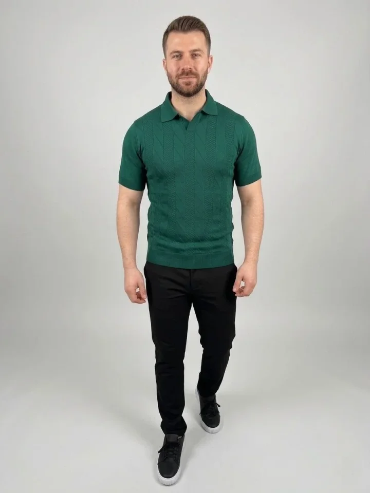 Erkek Yazlık Triko Dokuma Tişört Kısa Kol Polo Yaka T-Shirt – Koyu Yeşil