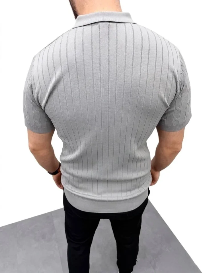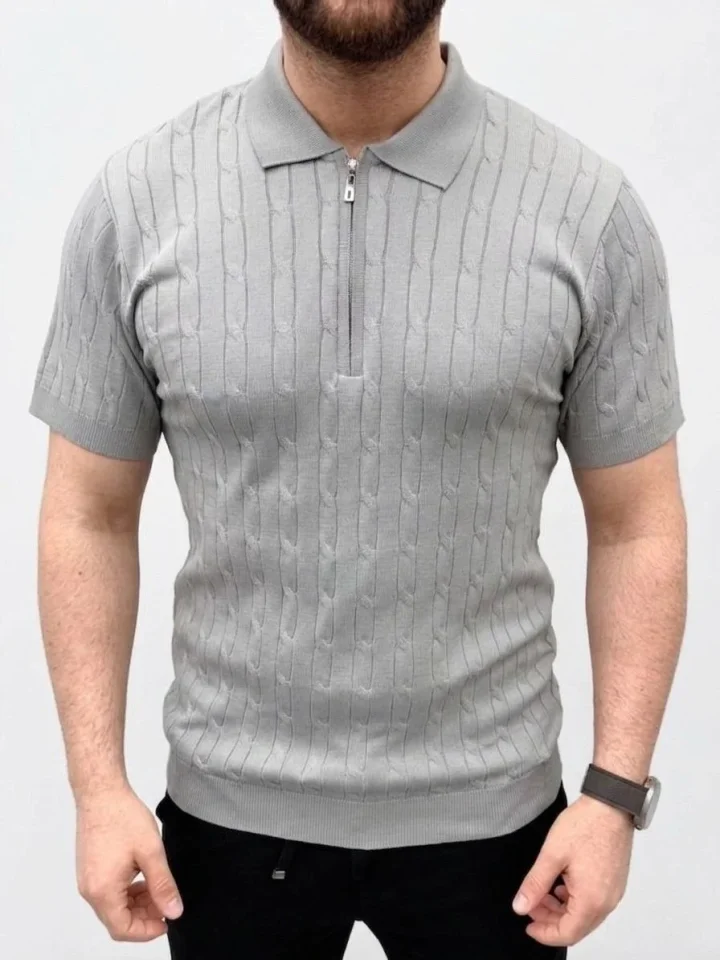 Erkek Yazlık Triko Saç Örgü Tişört Kısa Kol Polo Yaka Fermuarlı T-Shirt – Gri