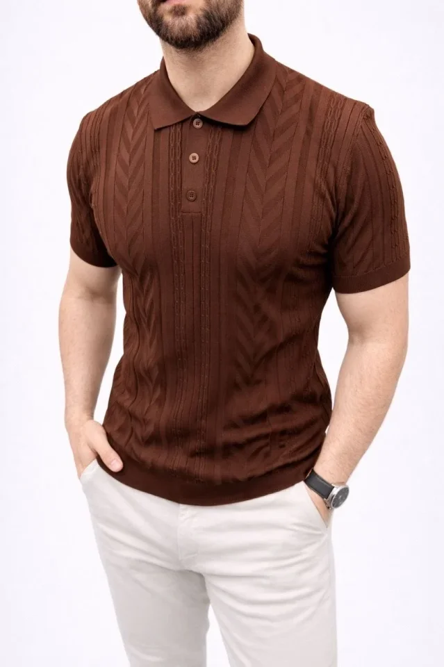 Erkek Yazlık Triko Tişört Kısa Kol Polo Yaka Düğmeli T-Shirt – Kahverengi