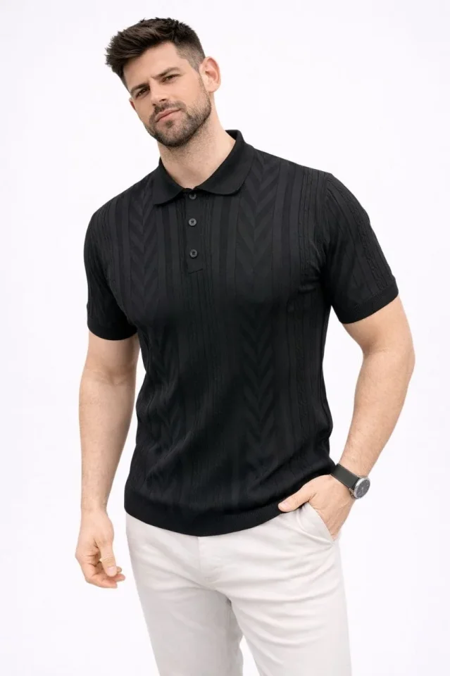 Erkek Yazlık Triko Tişört Kısa Kol Polo Yaka Düğmeli T-Shirt – Siyah