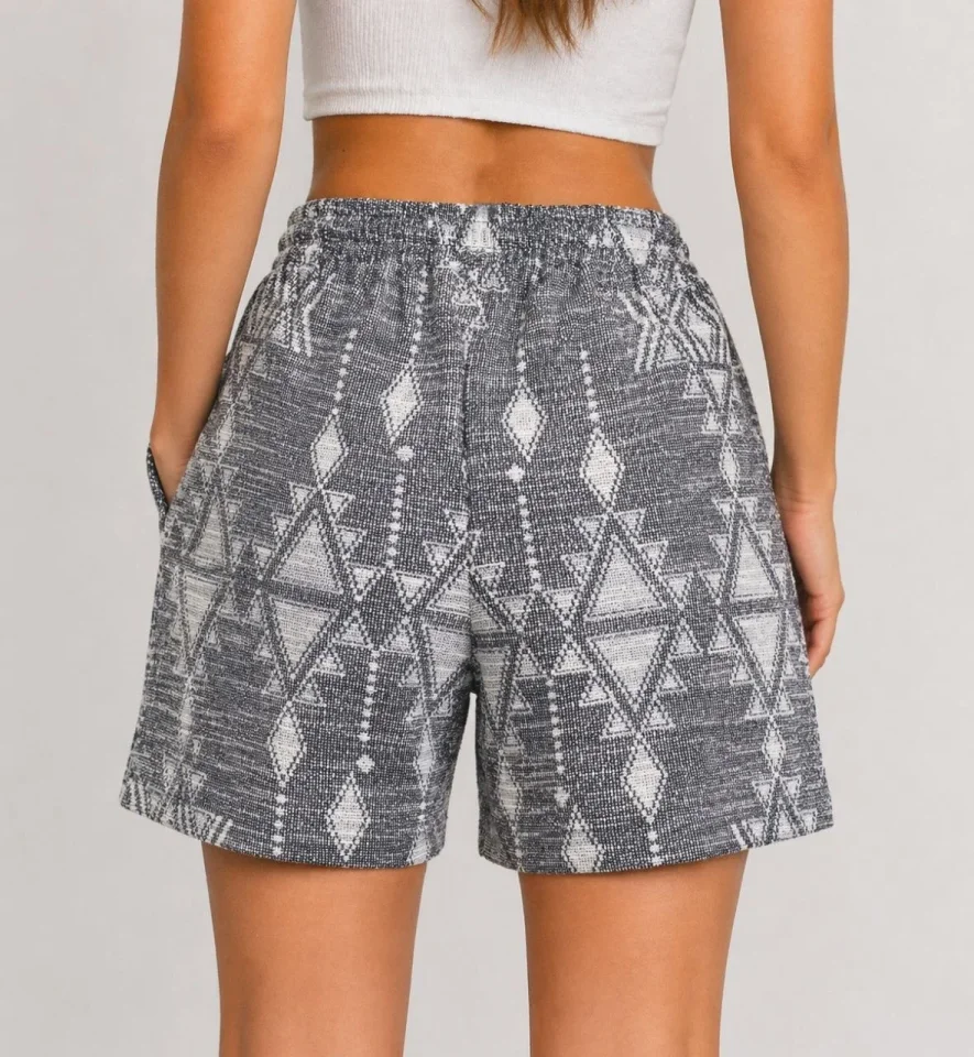 Etnik Desenli Dokuma Şort Yüksek Bel Lastikli Bağcıklı Cepli Yazlık Rahat – Gri
