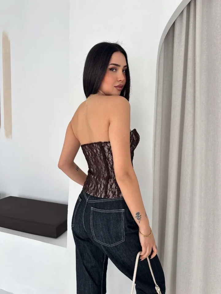 Fermuarlı Dantel Korse Straplez Bustiyer Transparan Şık Top – Kahverengi