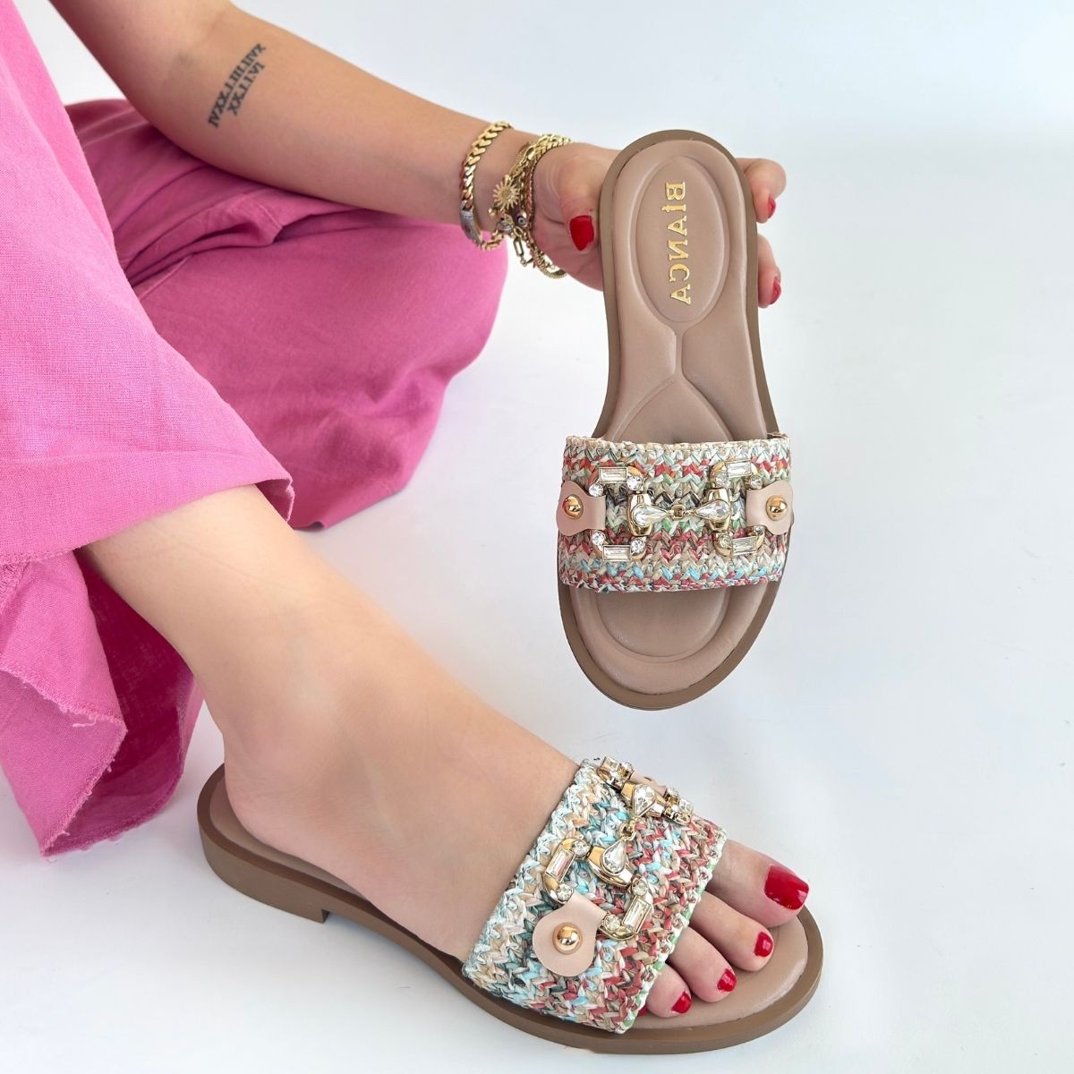 Kadın Konforlu Adım Gonne Renkli Hasır Dokuma Terlik