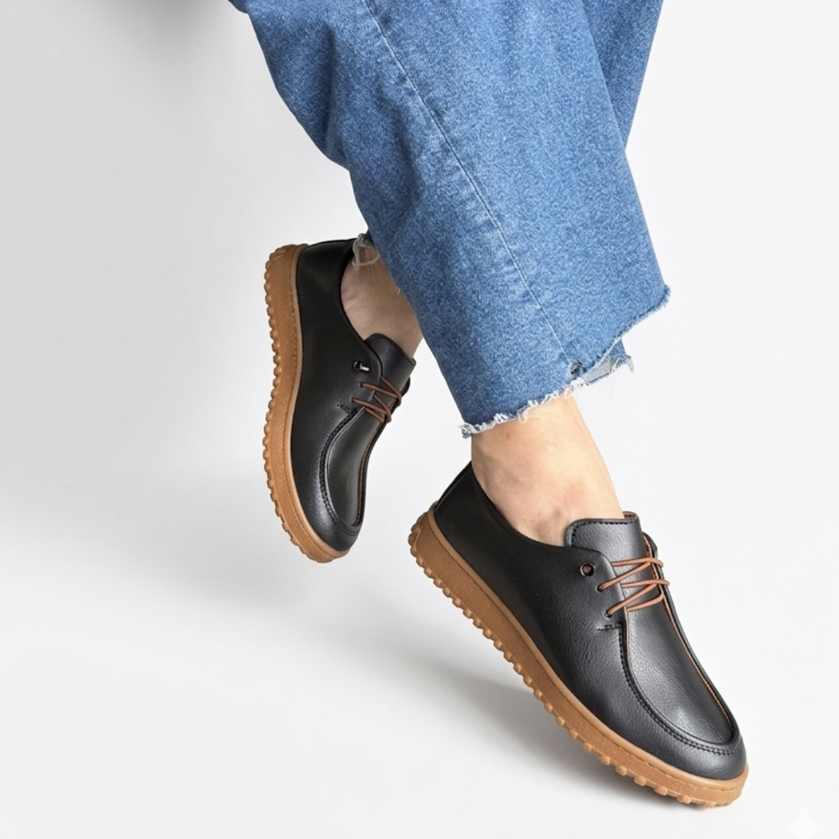 Cilt Kadın Konforlu Adım Guot Siyah Bağcıklı Babet Ayakkabı
