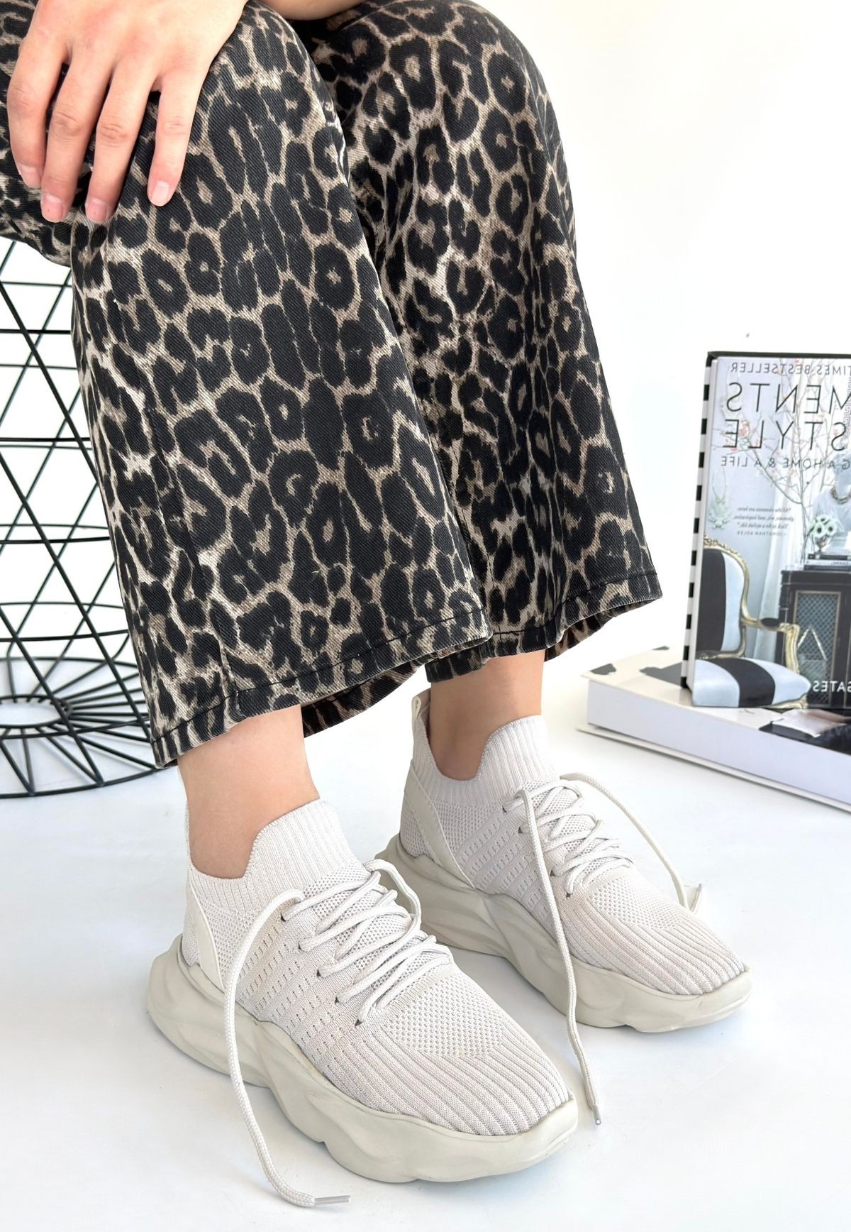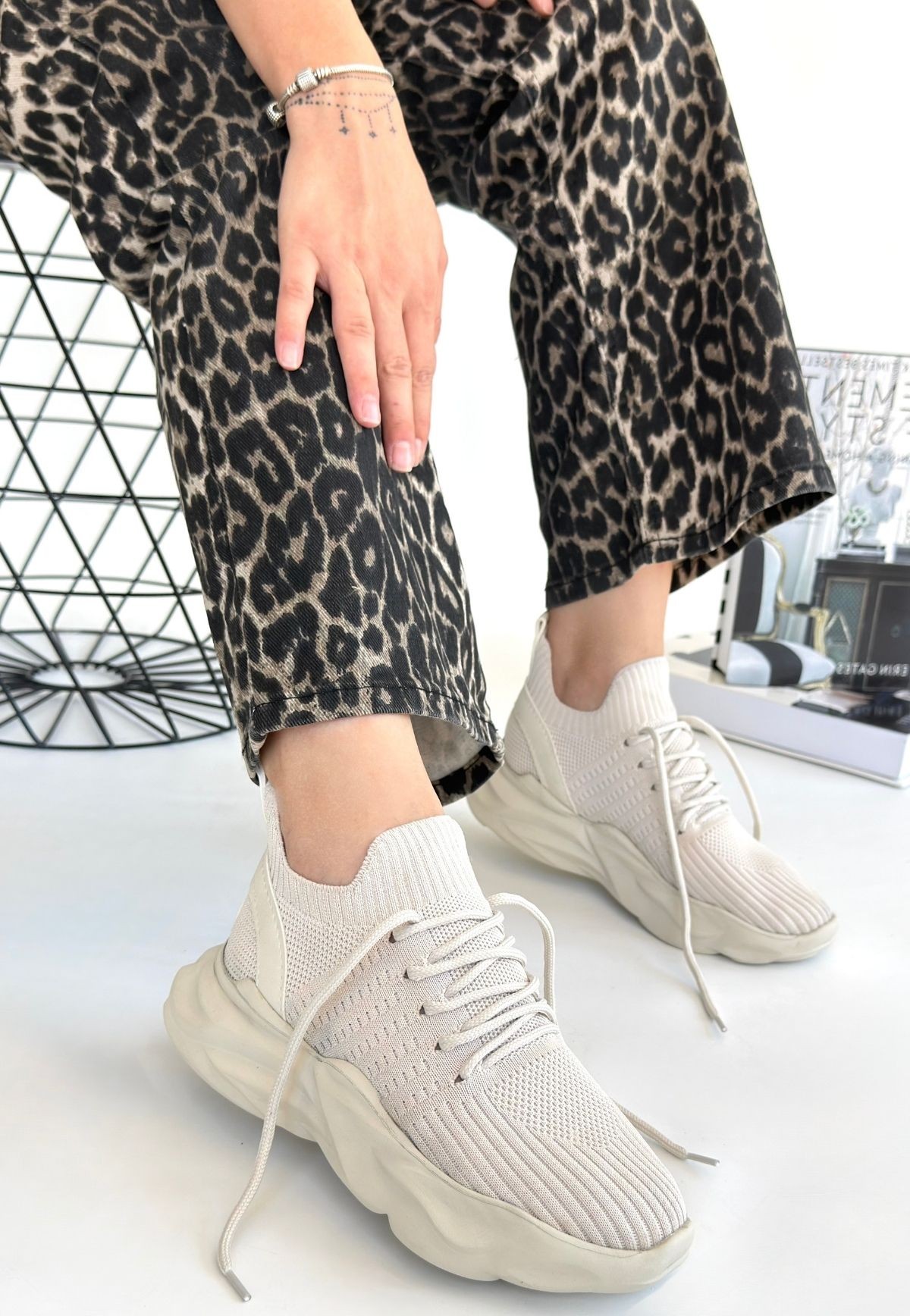 Kadın Konforlu Adım Henta Bej Triko Bağcıklı Spor Ayakkabı