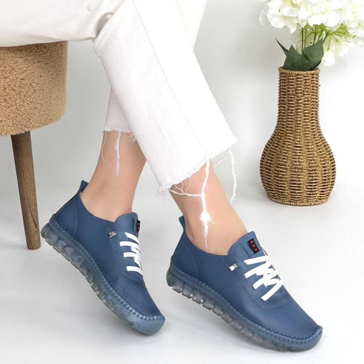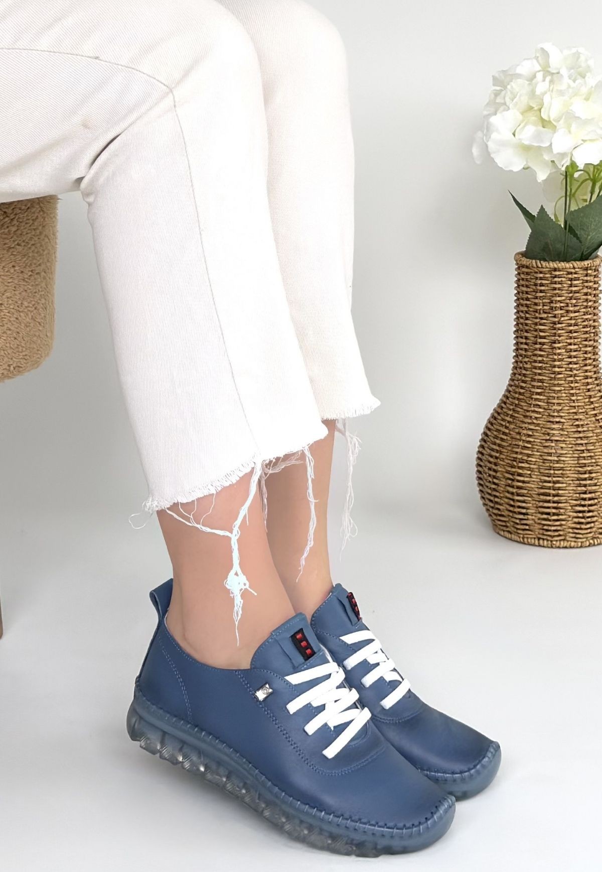 Kadın Konforlu Adım Jiten Mavi Deri Bağcıklı Spor Ayakkabı