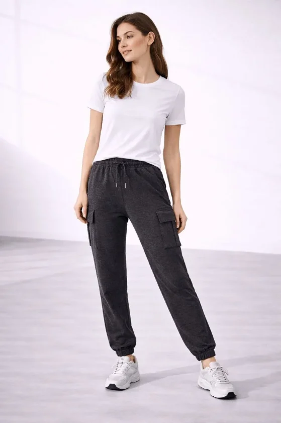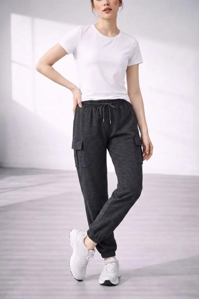 Kadın Füme Jogger Rahat Kalıp, Kargo Cepli, Lastikli Paça, Günlük Spor Pantolon Eşofman Altı