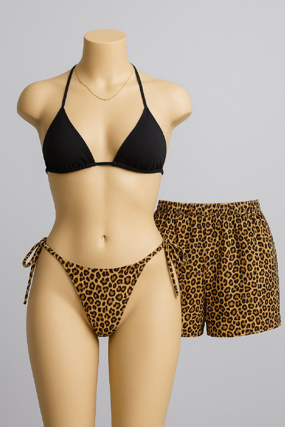 Kadın 3’lü Set Siyah ve Leopar Desenli Şortlu Yandan Bağlamalı Bikini Mayo Takımı