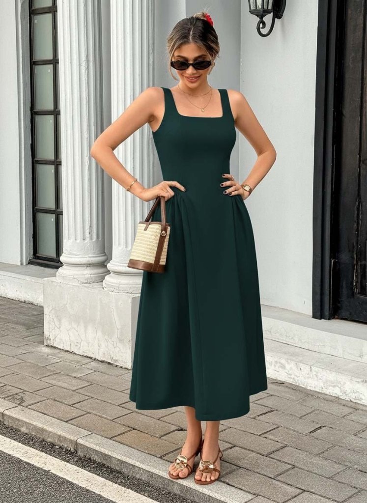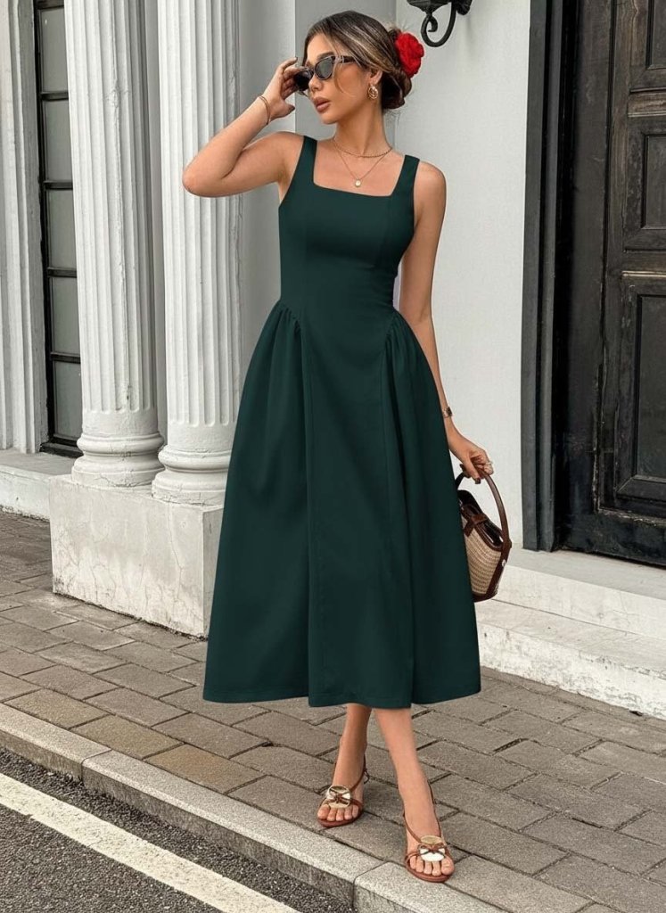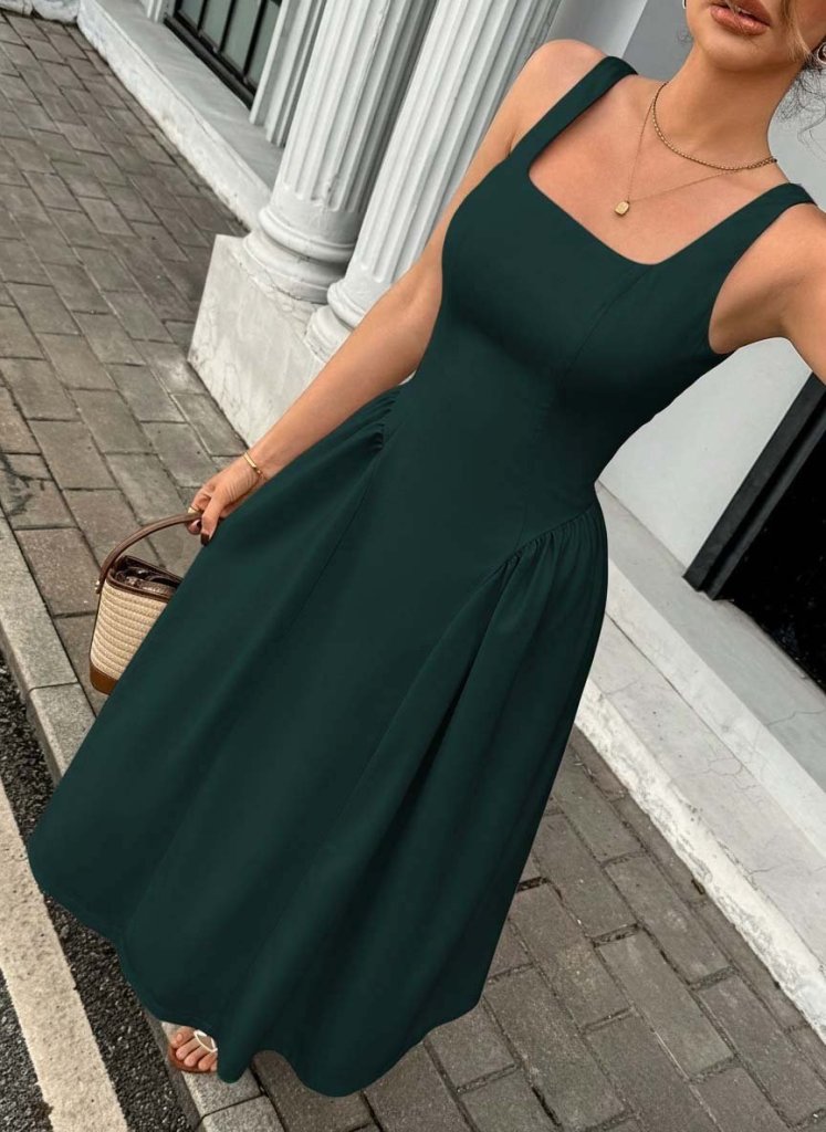 Kadın Askılı Kare Yakalı Uzun Ithal Krep Elbise
