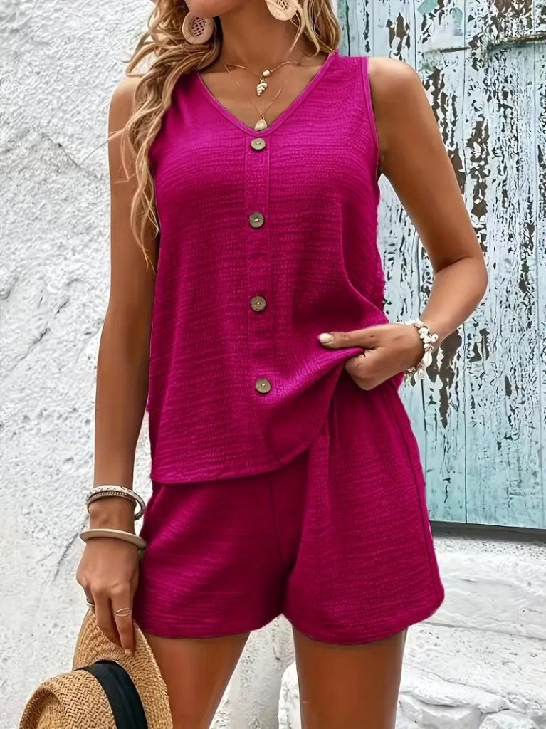 Kadın Askılı Kolsuz V Yakalı önden Düğmeli Bürümcük Bluz Ve Short Ikili Takım