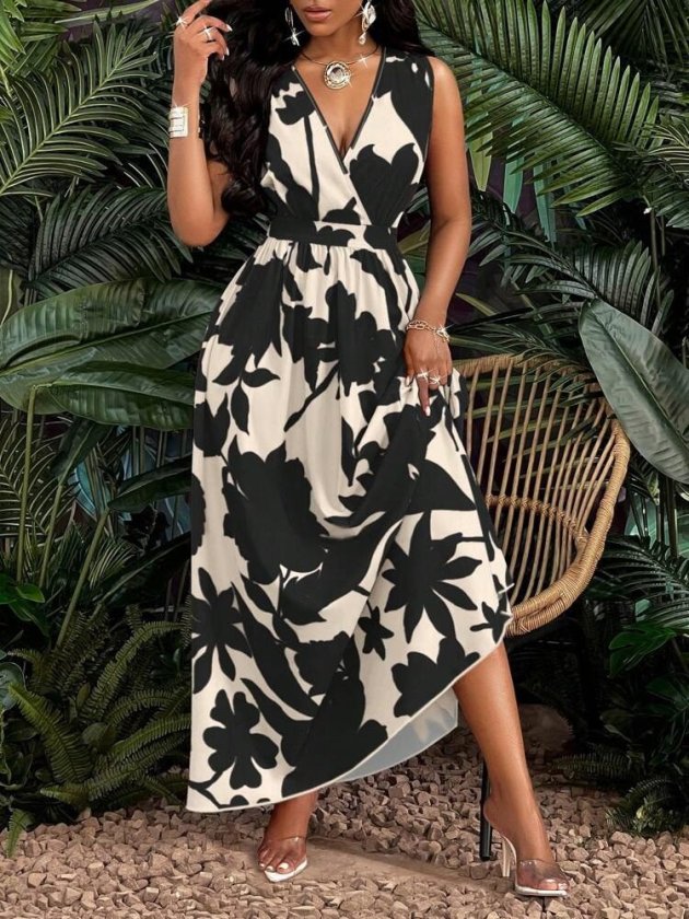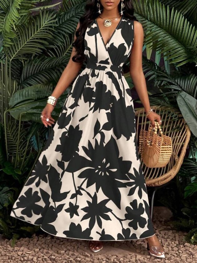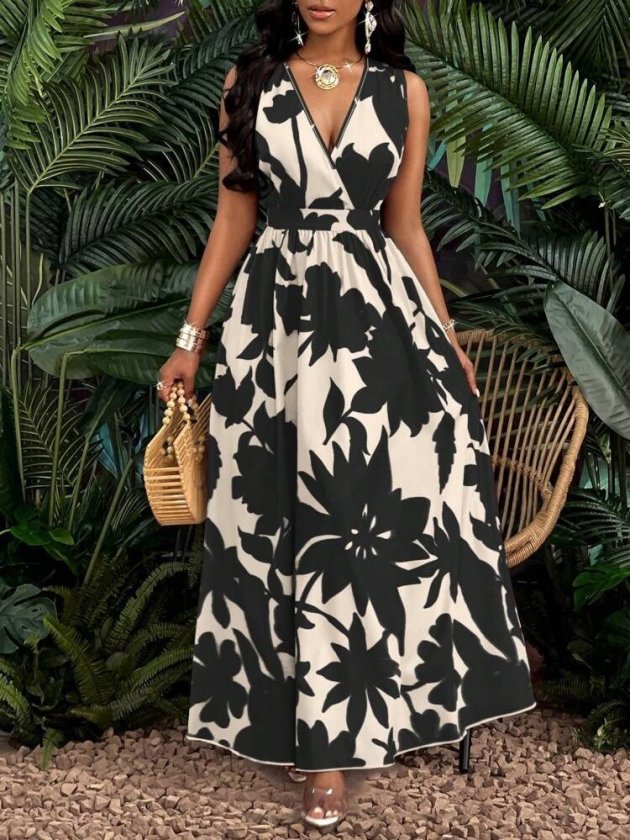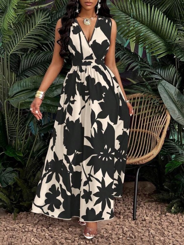 Kadın Askılı Kruvaze Yakalı çiçek Desenli Uzun Süprem Elbise
