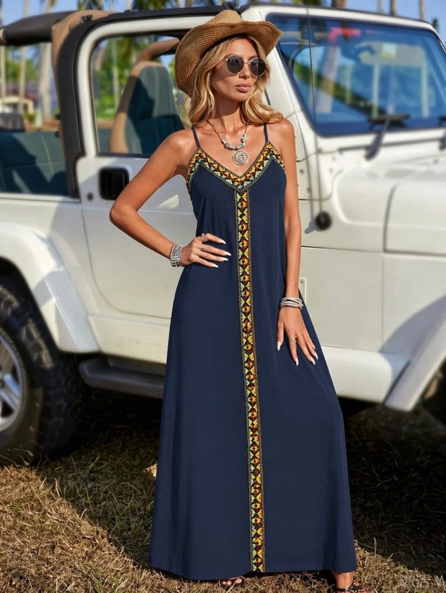 Kadın Askılı V Yakalı Etnik şerit Detaylı Uzun Viskon Elbise