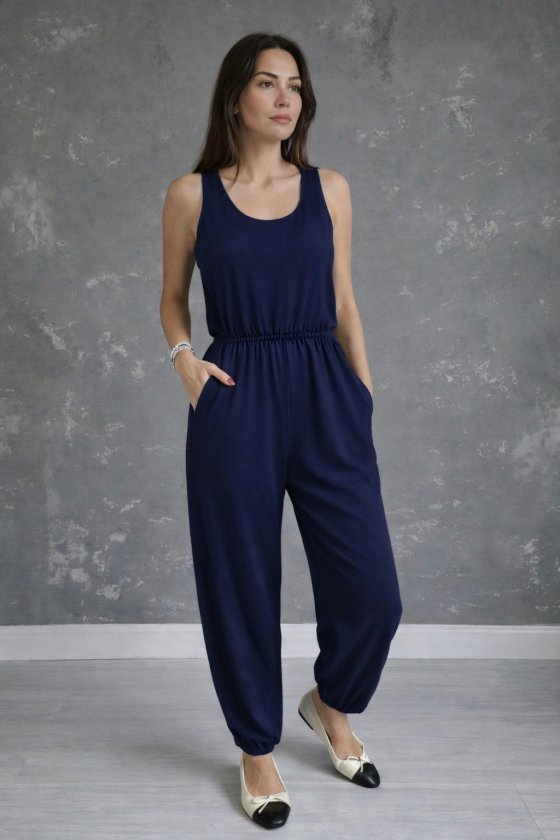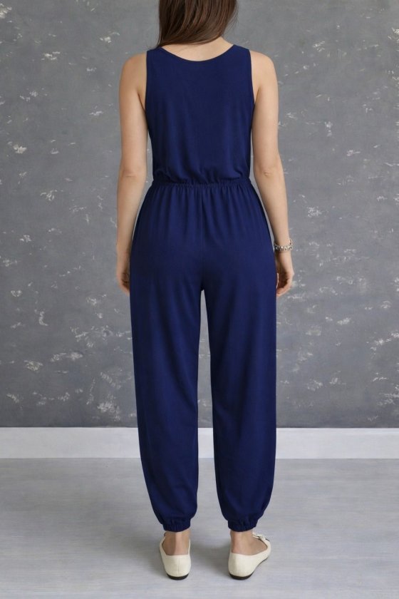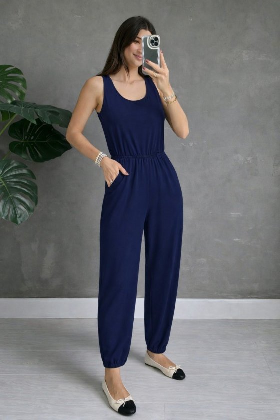 Kadın Askılı Yuvarlak Yakalı Cepli Viskon Tulum