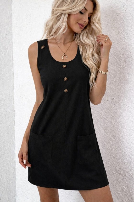 Kadın Askılı Yuvarlak Yakalı önden Düğmeli Cep Detaylı Kısa Elbise
