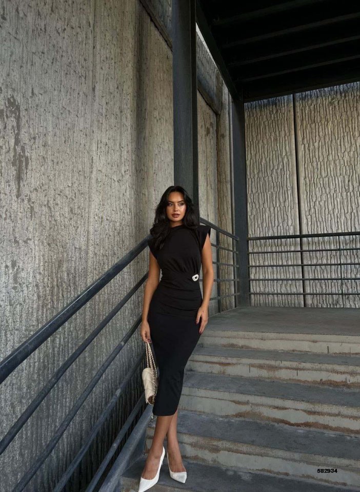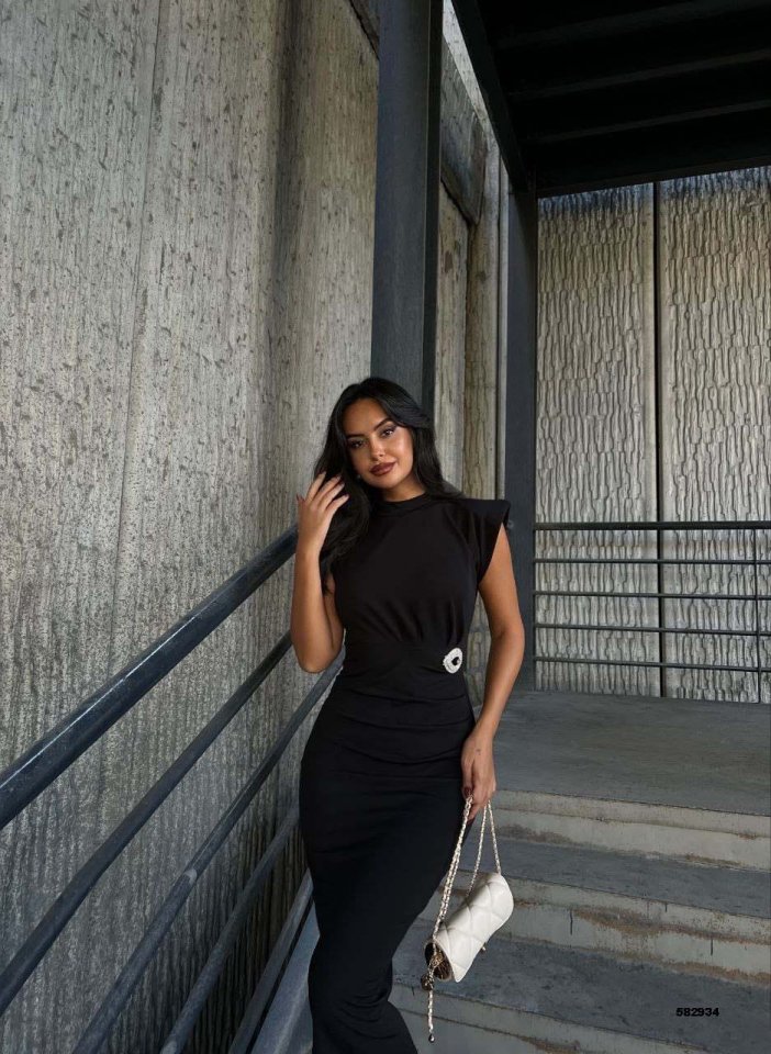 Kadın Zarif Duruş Bisiklet Yaka Vatkalı Broş Detay Kısa Kol Midi Boy Elbise