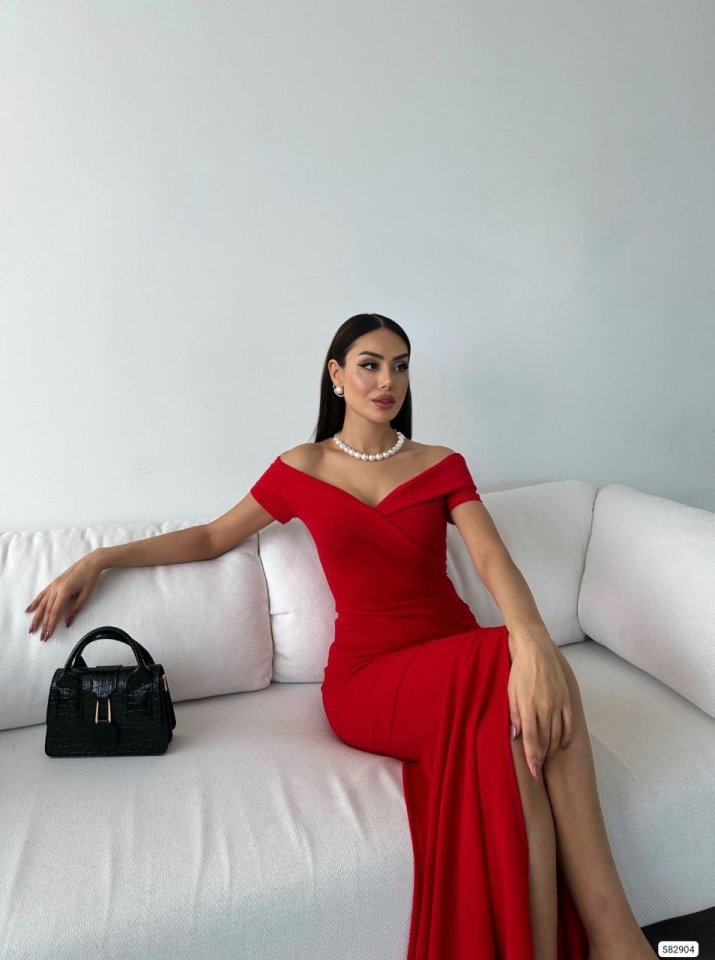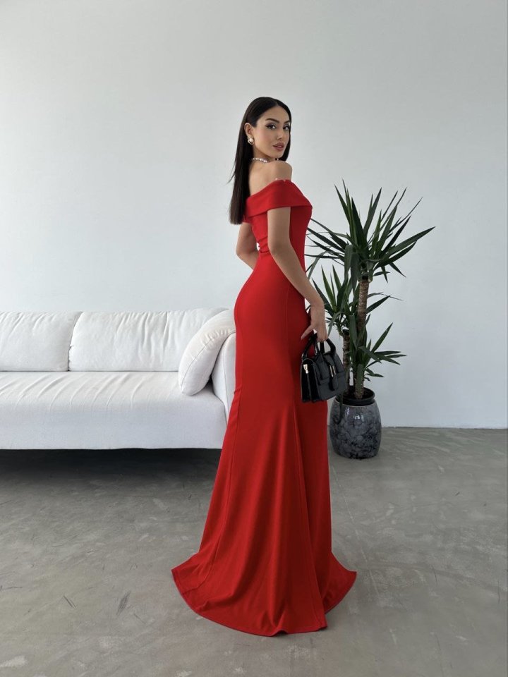 Dalgıç Kadın Zarif Duruş Kumaş Kayık Yaka Ve Dekolte Detaylı Elbise