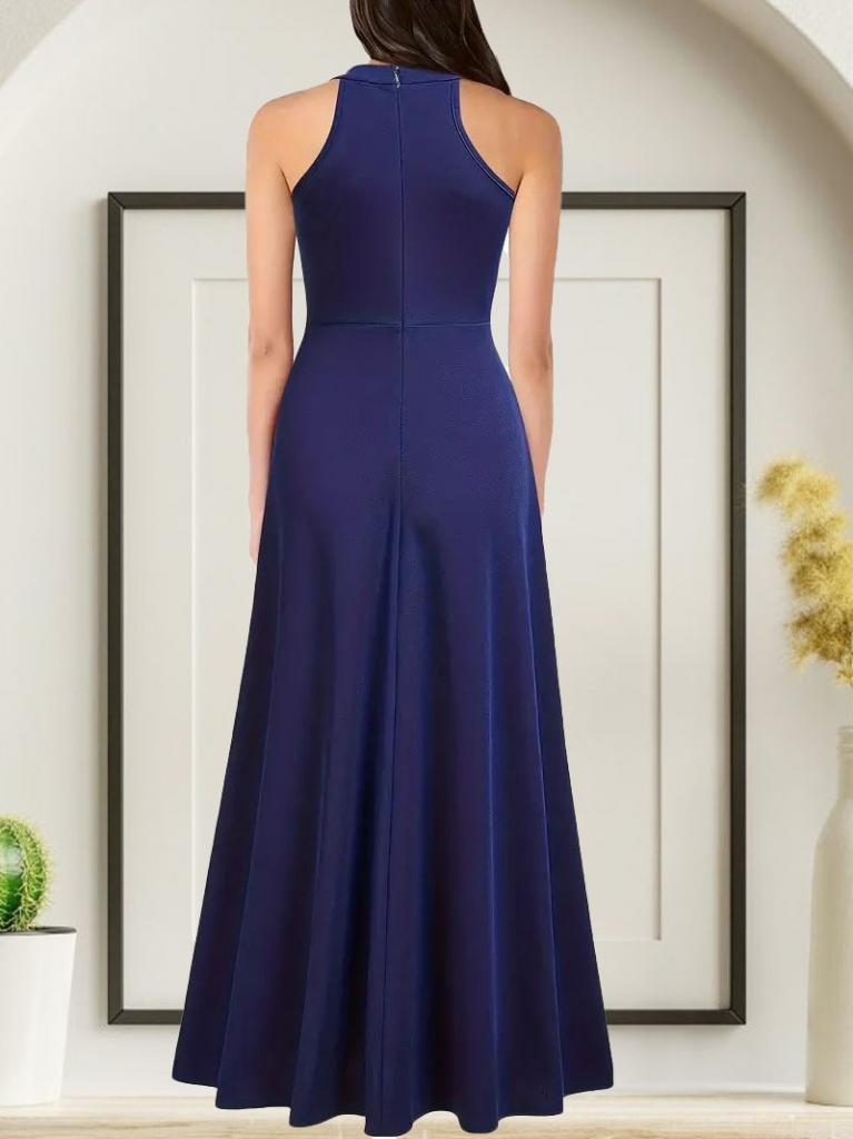Kadın Halter Yaka Derin Yırtmaç Detaylı Tam Boy Janjan Krep Abiye Elbise