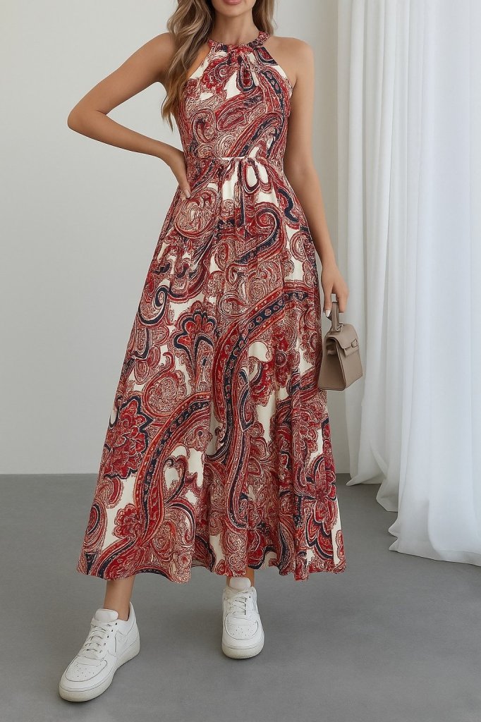 Kadın Halter Yakalı Omuzlardan Açık Kuşaklı Maksi Boy Desenli Süprem Elbise