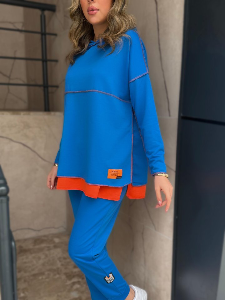 Kadın Indigo Kapşonlu Etek Ucu Detay Arma Ters Dikiş Gorunumlu Ikili Takım