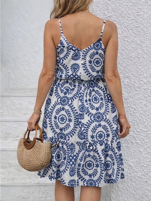 Desenli Kadın Zarif Duruş Ip Askılı V Yakalı Düğmeli Kısa Süprem Elbise