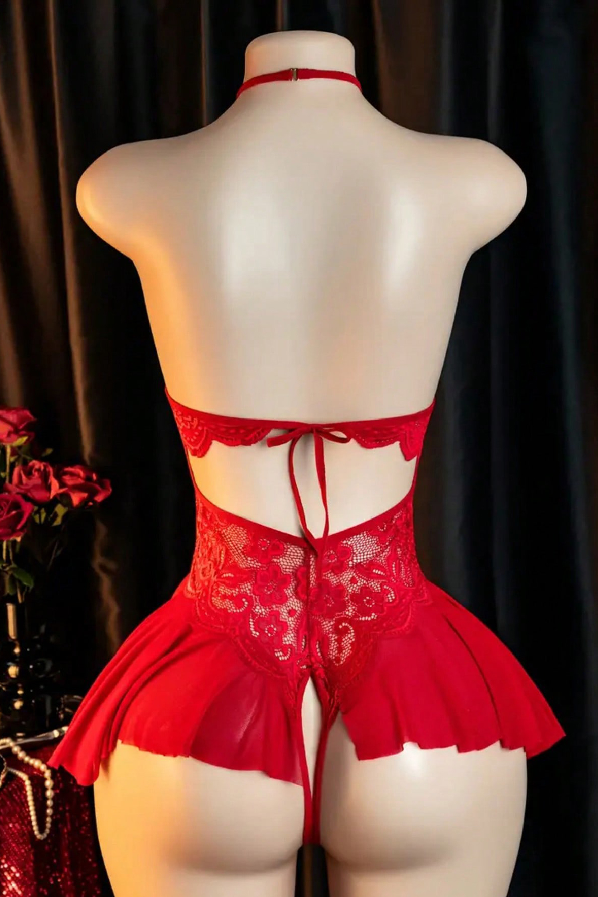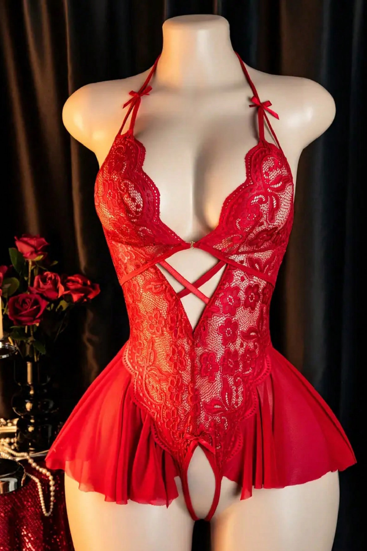 Kadın Kırmızı Dantel ve Tül Detaylı Derin V Yaka Teddy Gecelik