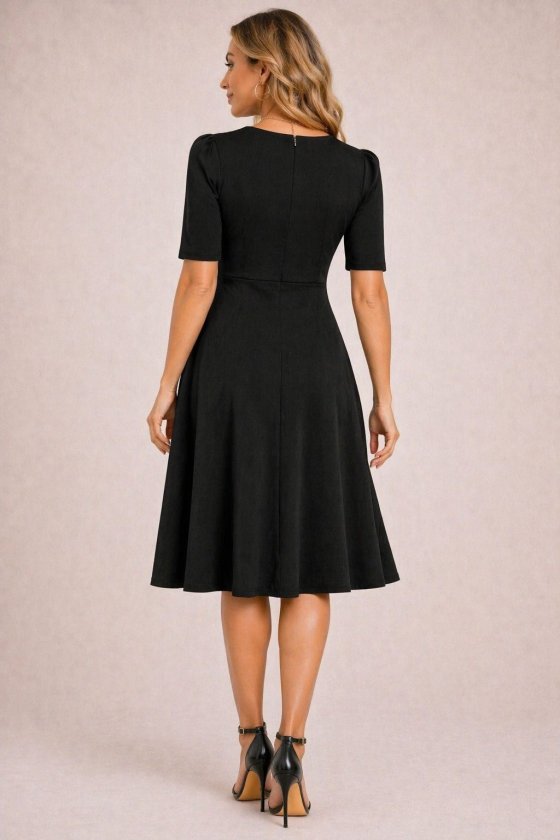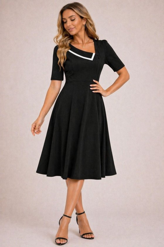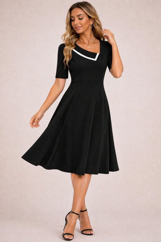 Kadın Kısa Kollu Asimetrik Yaka Detaylı Midi Janjan Krep Elbise