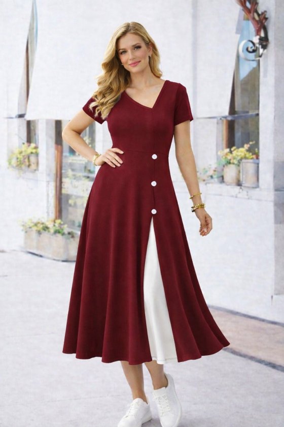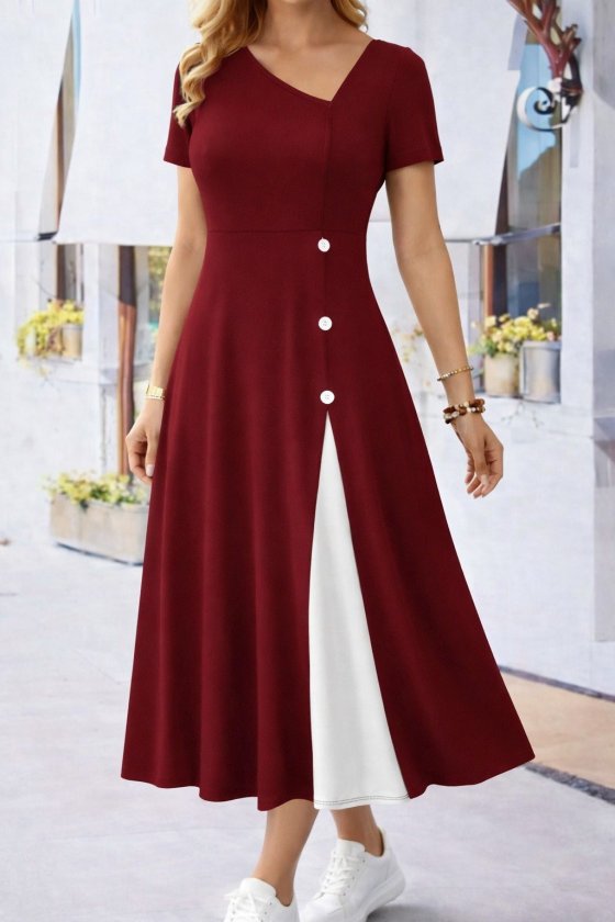 Kadın Kısa Kollu Asimetrik Yakalı Düğme Detaylı Midi Viskon Elbise